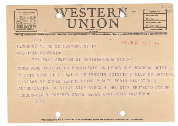 [Circular] N° 00468-323, 1948 feb. 16, Nueva York, [Estados Unidos] [a] Gabriela Mistral, Cónsul de Chile, 729 East Anapamu Street, Santa Bárbara, Cal. [manuscrito] Alfonso Grez.