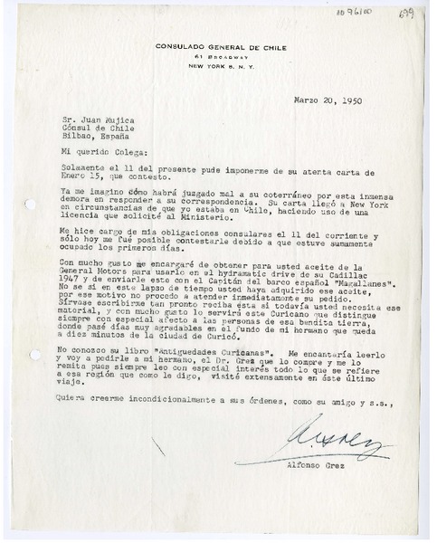 [Carta] 1950 marzo 20, New York [a] Juan Mujica de la Fuente, Bilbao, España [manuscrito] Alfonso Grez.