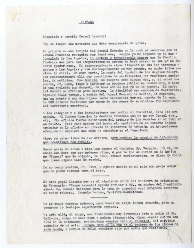 New York [al] Respetado y querido Cónsul General Alfonso Grez, California carta, 1948, [manuscrito] Gabriela, Mistral.