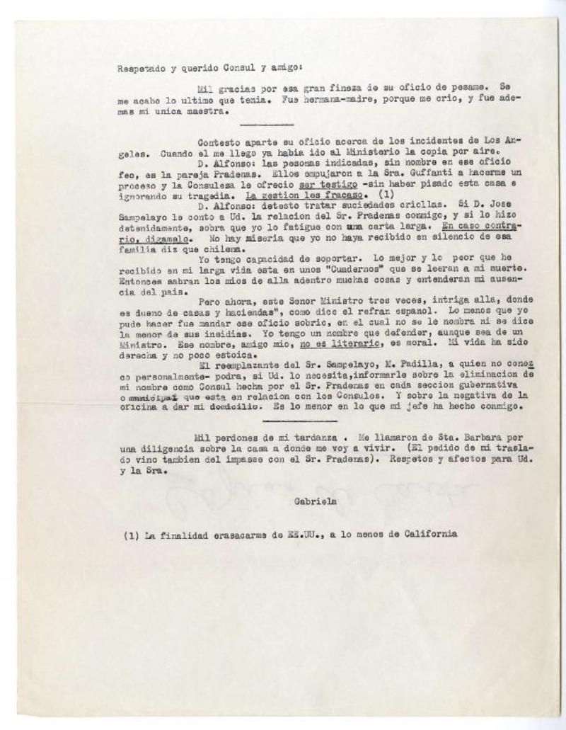 [Carta] [a] Respetado Cónsul [manuscrito] Gabriela Mistral.