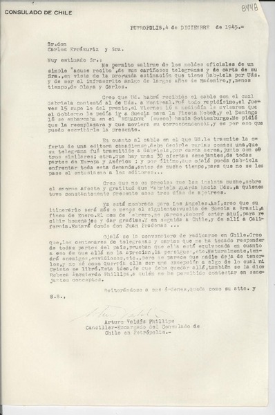 [Carta] 1945 dic. 4, Petrópolis [a] Carlos Errázuriz y Sra. [manuscrito] Arturo Valdés Phillips.