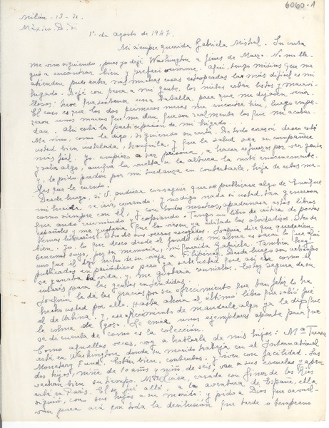 [Carta] 1947 ago. 1, México D.F. [a] Gabriela Mistral [manuscrito] Teresa [de Díez-Canedo].