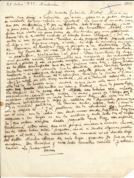 [Carta] 1933 jul. 22, Montevideo [a] Gabriela Mistral [manuscrito] Teresa de Díez-Canedo.