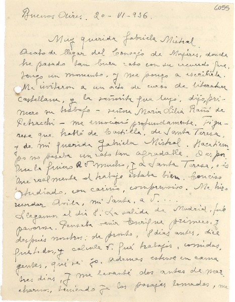 [Carta] 1936 jun. 20, Buenos Aires [a] Gabriela Mistral [manuscrito] Teresa de Díez-Canedo.