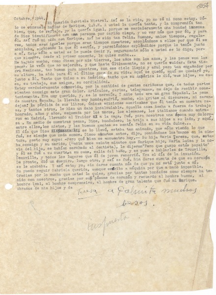 [Carta] 1944 oct. [a] Gabriela Mistral [manuscrito] Teresa de Díez-Canedo.