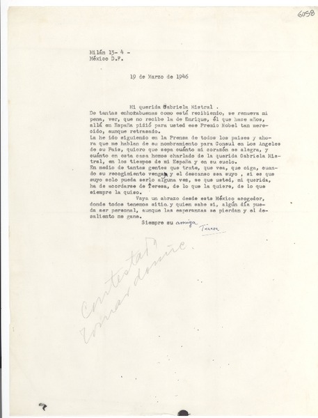 [Carta] 1946 mar. 19, México D. F. [a] Gabriela Mistral [manuscrito] Teresa de Díez-Canedo.