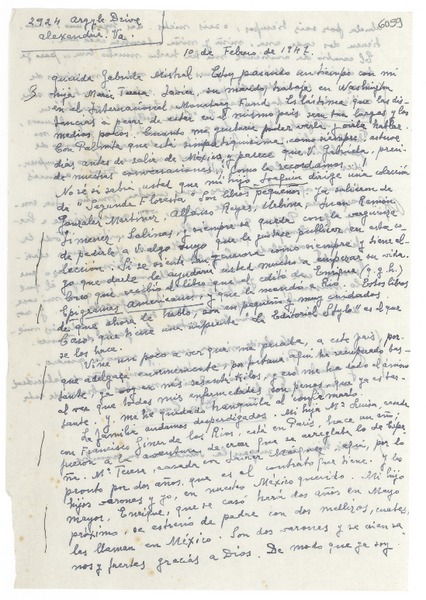 [Carta] 1947 feb. 1, Alexandria, [Estados Unidos] [a] Gabriela Mistral [manuscrito] Teresa de Díez-Canedo.