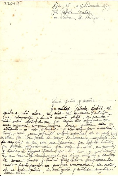 [Carta] 1937 dic. 17, México, D. F., México [a] Gabriela Mistral, Lisboa, Portugal [manuscrito] Esperanza Zambrano de Wimer.