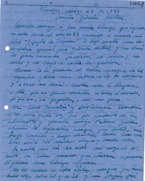 [Carta] 1940 mayo 27, [México] [a] Gabriela Mistral [manuscrito] Adela [Formosa de Obregón Santacilla].