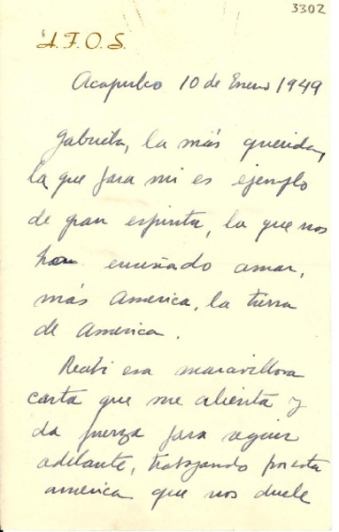 [Carta] 1949 ene. 10, Acapulco, [México] [a] Gabriela Mistral [manuscrito] A. F. O. S.