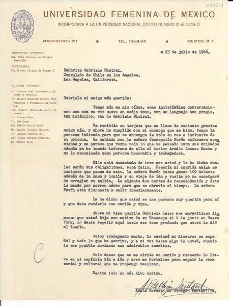 [Carta] 1946 jul. 25, México D.F. [a] Gabriela Mistral, Los Angeles, California, [EE.UU.] [manuscrito] Adela Formoso de Obregón Santacilia.