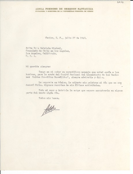 [Carta] 1948 jul. 27, México D.F. [a] Gabriela Mistral, Los Angeles, California [manuscrito] Adela Formoso de Obregón Santacilia.
