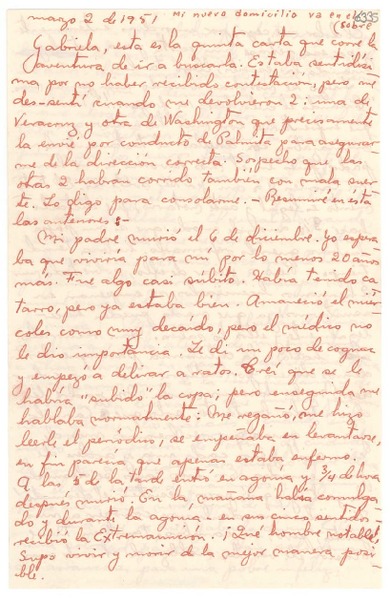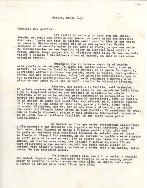 [Carta] 1950 mar. 6, México [a] Gabriela [Mistral] [manuscrito] Margarita [Michelena].
