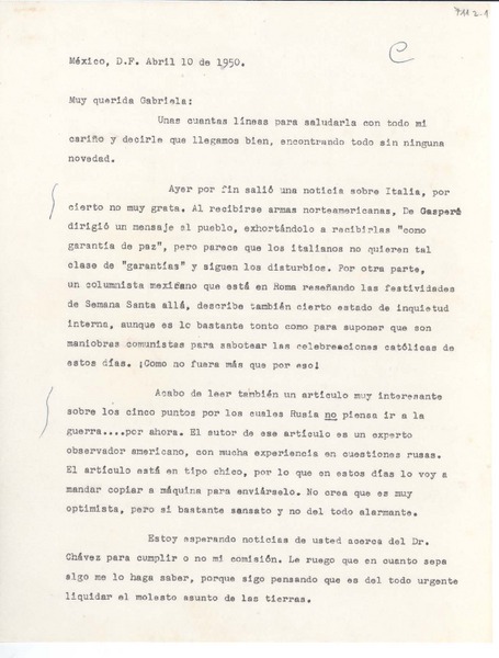 [Carta] 1950 abr. 10, México D.F. [a] Gabriela [Mistral] [manuscrito] Margarita [Michelena].