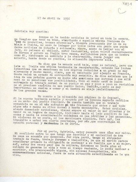 [Carta] 1950 abr. 17, [México] [a] Gabriela [Mistral] [manuscrito] Margarita [Michelena].