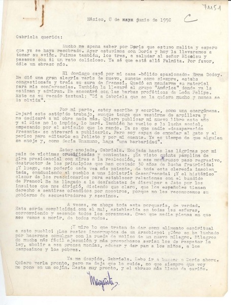 [Carta] 1950 jun. 8, México [a] Gabriela [Mistral] [manuscrito] Margarita [Michelena].