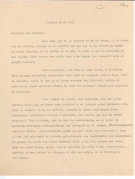 [Carta] 1950 oct. 13, [México] [a] Gabriela [Mistral] [manuscrito] Margarita [Michelena].