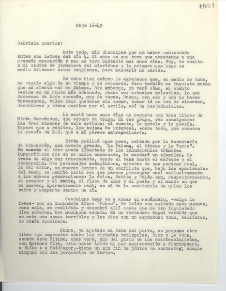 [Carta] 1949 mayo 16, [México] [a] Gabriela Mistral [manuscrito] Margarita [Michelena].