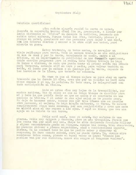 [Carta] 1949 sept. 26, [México] [a] Gabriela Mistral [manuscrito] Margarita [Michelena].