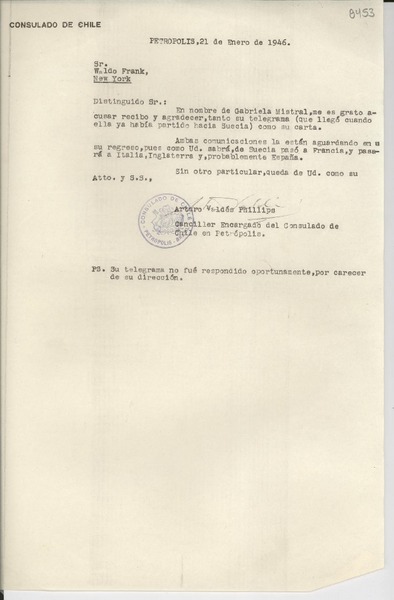 [Carta] 1946 ene. 21, Petrópolis [a] Waldo Frank, New York [manuscrito] Arturo Valdés Phillips.