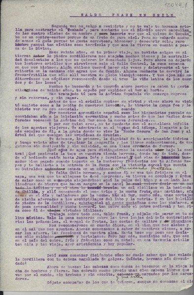 Correspondencia - Mistral, Gabriela - Autores estadounidenses - Manuscritos estadounidenses - Frank, Waldo