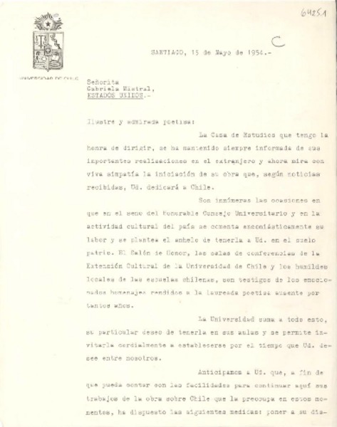 [Carta] 1954 mayo 15, Santiago, [Chile] [a] Gabriela Mistral, Estados Unidos [manuscrito] Juan Gomez Millas.