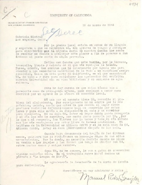 [Carta] 1946 mar. 28, Los Angeles, California [a] Gabriela Mistral, Los Angeles, Calif[ornia] [manuscrito] Manuel Pedro González.