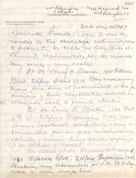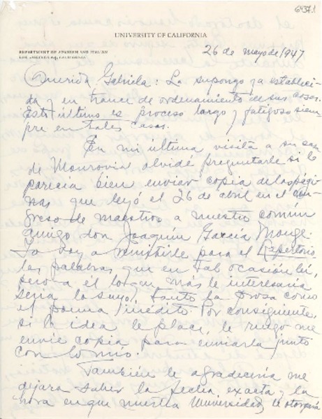[Carta] 1947 abr. 30, Los Ángeles, California [a] Gabriela Mistral [manuscrito] Manuel Pedro González.