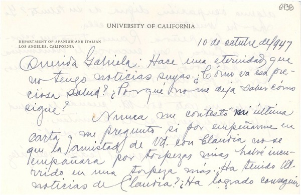 [Carta] 1947 oct. 10, Los Ángeles, California [a] Gabriela Mistral [manuscrito] Manuel Pedro González.