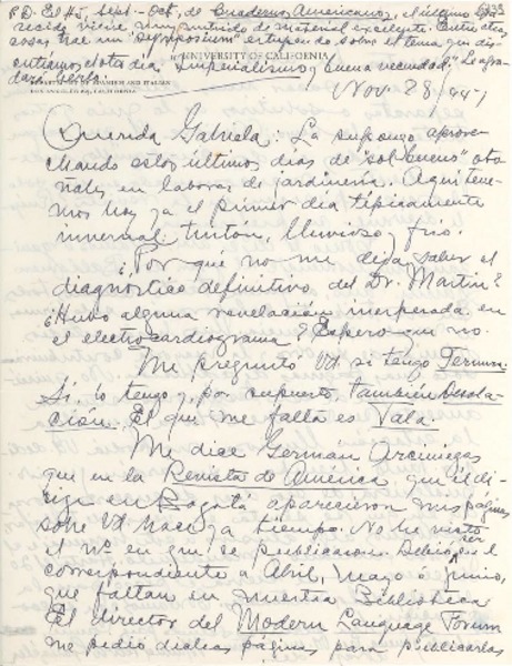 [Carta] 1947 nov. 28, Los Ángeles, California [a] Gabriela Mistral [manuscrito] Manuel Pedro González.