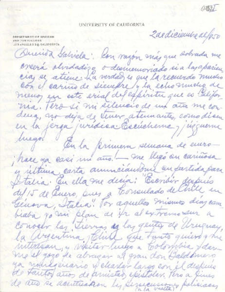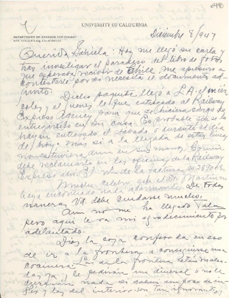 [Carta] 1947 dic. 8, Los Ángeles, California [a] Gabriela Mistral [manuscrito] Manuel Pedro González.