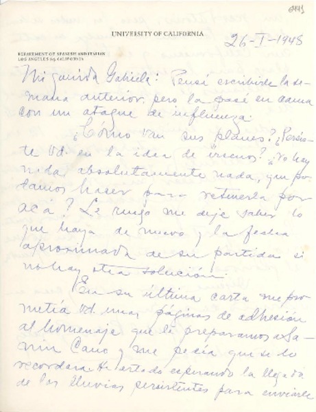 [Carta] 1948 ene. 26, Los Ángeles, California [a] Gabriela Mistral [manuscrito] Manuel Pedro González.