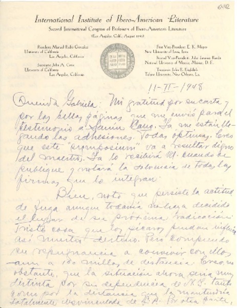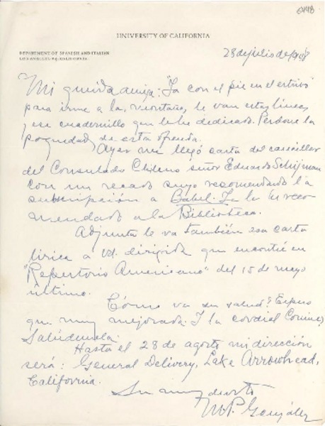 [Carta] 1948 jul. 28, Los Ángeles, California [a] Gabriela Mistral [manuscrito] Manuel Pedro González.