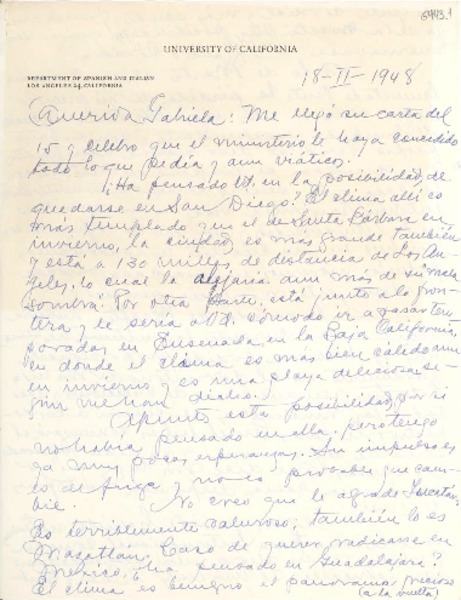 [Carta] 1948 feb. 18, Los Ángeles, California [a] Gabriela Mistral [manuscrito] Manuel Pedro González.