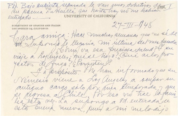 [Carta] 1948 mar. 27, Los Ángeles, California [a] Gabriela Mistral [manuscrito] Manuel Pedro González.