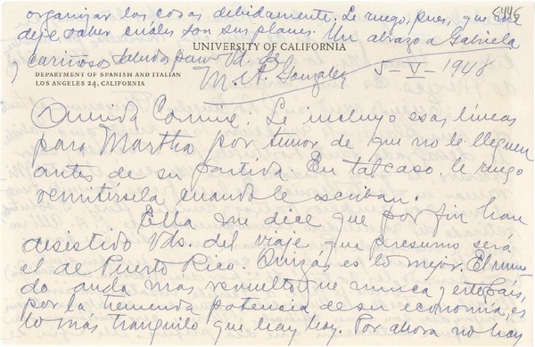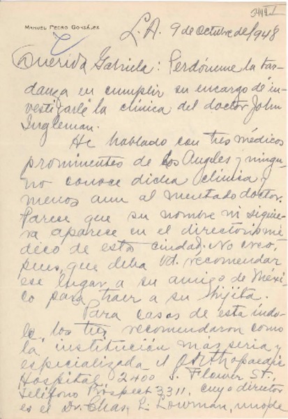 [Carta] 1948 oct. 9, Los Ángeles, California [a] Gabriela Mistral [manuscrito] Manuel Pedro González.