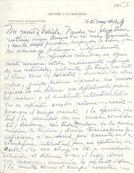 [Carta] 1949 mayo 16, Los Ángeles, California [a] Gabriela Mistral [manuscrito] Manuel Pedro González.