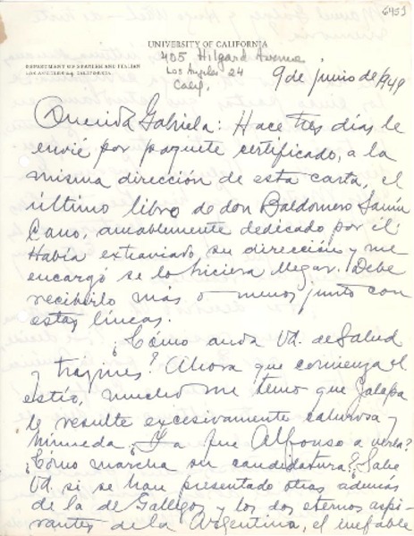 [Carta] 1949 jun. 9, Los Ángeles, California [a] Gabriela Mistral [manuscrito] Manuel Pedro González.
