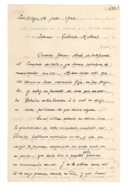 [Carta] 1946 jun. 12, San Diego [a] Gabriela Mistral [manuscrito] Adriana Guffanti.