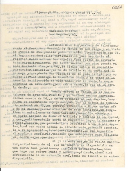 [Carta] 1946 jun. 13, Tijuana [a] Gabriela Mistral, Los Ángeles, California [manuscrito] Adriana Guffanti.