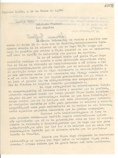 [Carta] 1946 jun. 26, Tijuana [a] Gabriela Mistral, Los Ángeles [manuscrito] Adriana Guffanti.