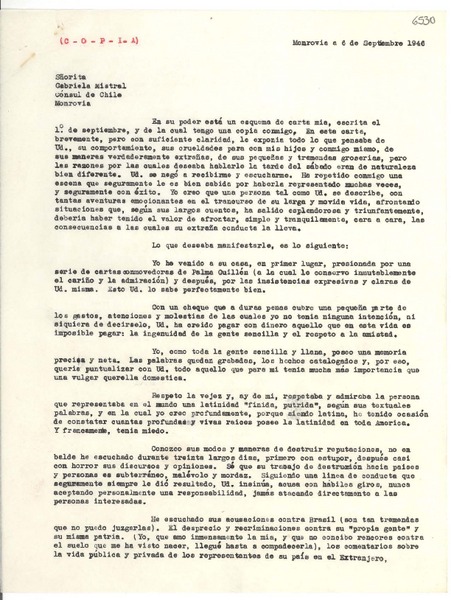 [Carta] 1946 sept. 6, Monrovia [a] Gabriela Mistral, Monrovia [manuscrito] Adriana Guffanti.