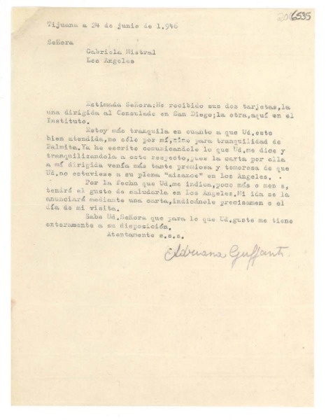 [Carta] 1946 jun. 24, Tijuana [a] Gabriela Mistral, Los Ángeles [manuscrito] Adriana Guffanti.