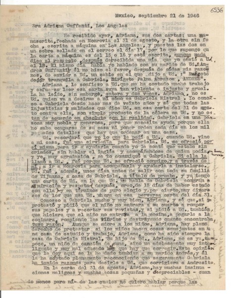 [Carta] 1946 sept. 21, México [a] Adriana Guffanti, Los Ángeles [manuscrito] Palma Guillén.