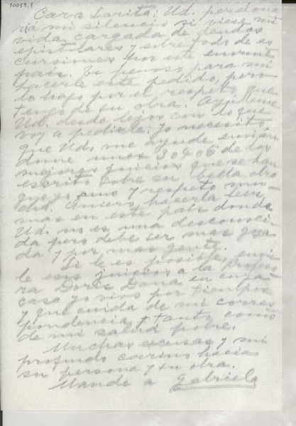 [Carta] [a] Sara de Ibañez [manuscrito] Gabriela Mistral.