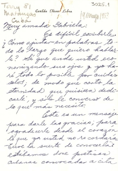 [Carta] 1953 mayo. 19, Matanzas, Cuba [a] Gabriela Mistral [manuscrito] Carilda Oliver Labra.