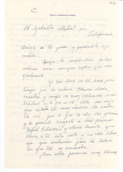 [Carta] 1948 abr. 2, La Habana, [Cuba] [a] Gabriela Mistral, California, [EE.UU.] [manuscrito] Dulce María Loynaz.