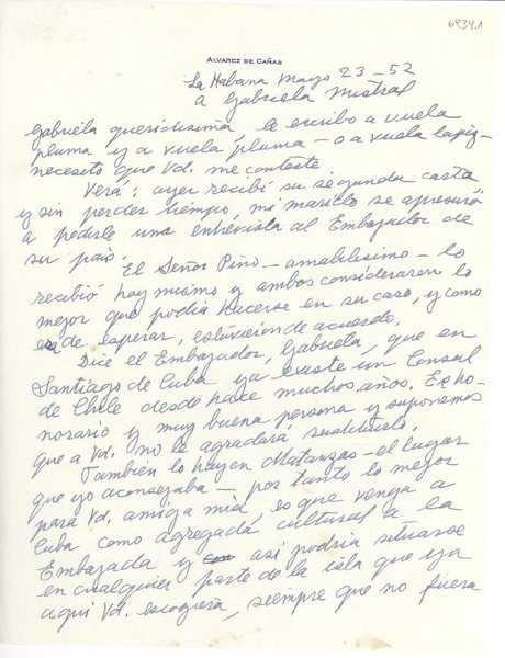 [Carta] 1952 mar. 23, La Habana, [Cuba] [a] Gabriela Mistral [manuscrito] Dulce María [Loynaz].