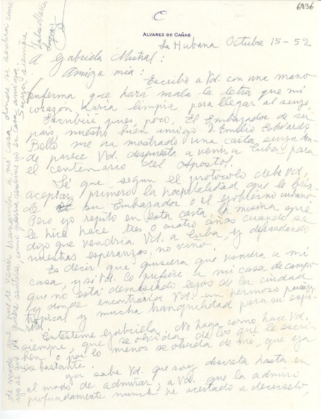 [Carta] 1952 oct. 15, La Habana, [Cuba] [a] Gabriela Mistral [manuscrito] Dulce María Loynaz.