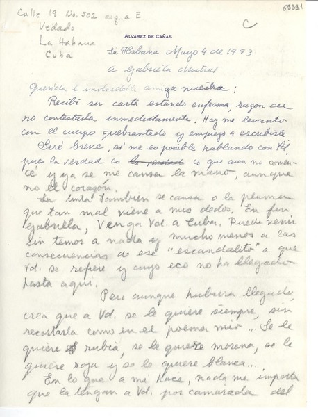[Carta] 1953 mayo 4, La Habana, [Cuba] [a] Gabriela Mistral [manuscrito] Dulce María Loynaz.